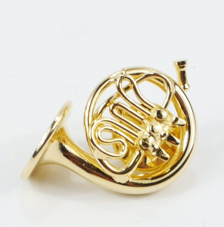 Aranyozott kürt kitűző ajándékdobozban