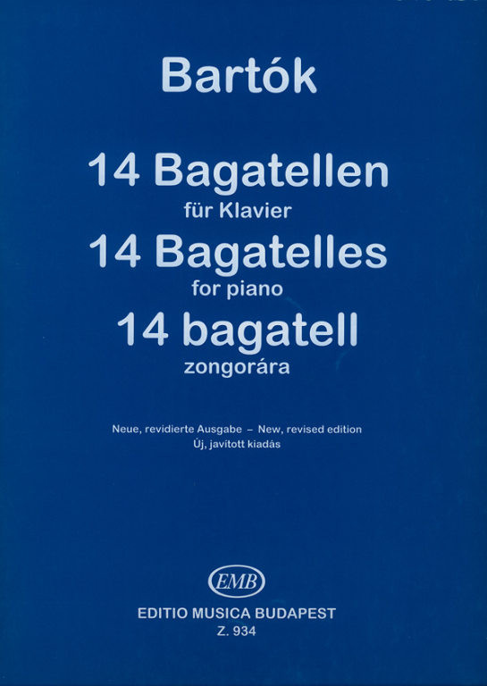 • Bartók Béla a század első évtizedében komponálta ezt a tizennégy zongoradarabját, melyeknek szerényen a Bagatellek címet adta. Az utolsó darab befejezésekor alig volt 27 éves.' Ezek a mondatok vezetik be Bartók Péternek, a nagy zeneszerző Amerikában élő fiának jegyzetét, amelyben röviden ismerteti a mű keletkezésének és további kiadásainak történetét, beleértve a jelenlegi, komoly forráskutatás alapján elkészült s általa jegyzett, javított közreadást is. Idézzük a zeneszerzőnek egy megállapítása is, miszerint a Bagatellekben 'a 19. századi romantikus zongoramuzsika érzelmességének ellenhatásaként egy új zongorastílus jelenik meg...' Valójában ez az új stílus kölcsönzi a Bagatellek zenetörténeti jelentőségét és máig tartó népszerűségét. Ez a kiadás teljesen új kottagrafikával készült, s szándéka szerint korrigálja a korábbi kiadások tévedéseit. (Hungaroton HCD 32525) Tartalomjegyzék1. Molto sostenuto 2. Allegro giocoso 3. Andante 4. Grave 5. Vivo 6. Lento 7. Allegretto molto capriccioso 8. Andante sostenuto 9. Allegretto grazioso 10. Allegro 11. Allegretto molto rubato 12. Rubato 13. Lento funebre (Elle est morte - - -) 14. Valse (Ma mie qui danse -