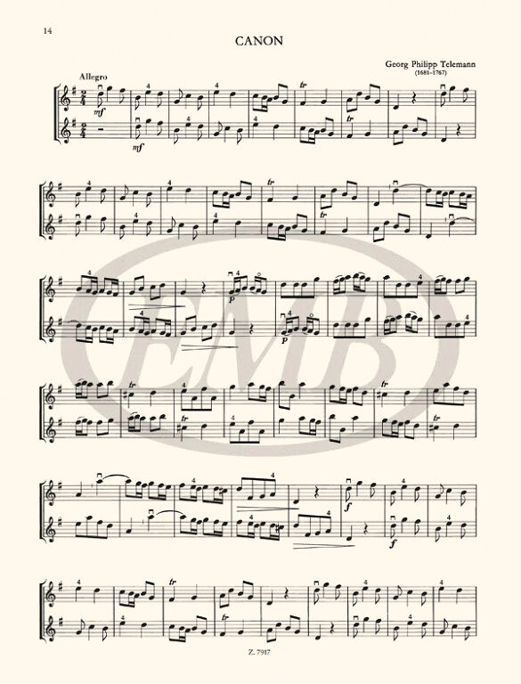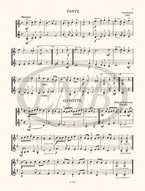 • dall' Abaco, Evaristo Felice: Largo20.Mouret, Jean-Joseph: Bourrée21.Telemann, Georg Philipp: Canon22.Rameau, Jean-Philippe: Rigaudon23.Rameau, Jean-Philippe: Gavotte24.Händel, Georg Friedrich: Menüett25.Bach, Johann Sebastian: Canon26.Bach, Johann Sebastian: Canon inversus27.Bach, Johann Sebastian: Canon cancrizans28.Bach, Johann Sebastian: Korál äGott, wie gross ist deine Güteö29.Bach, Johann Sebastian: Korál äEins ist notö30.Bach, Johann Sebastian: Korál äDir, dir, Jehova, will ich singenö31.Mozart, Leopold: Passepied32.Mozart, Leopold: Bourlesq33.Mozart, Leopold: Trompeten-Stück34.Mozart, Leopold: Wald-Horn-Stück35.Mozart, Leopold: March36.Haydn, Franz Joseph: Duet37.Pleyel, Ignaz Josef: Duo38.Mozart, Wolfgang Amadeus: Canon inversus39.Beethoven, Ludwig van: Canon40.Schubert, Franz: Ländler41.Schubert, Franz: Ecossaise