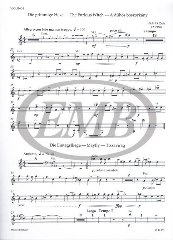 • Az 1968-as születésű, rendkívül tehetséges zeneszerző és karmester háromtételes műve ifjúsági vonószenekarra, zongorára és ütőhangszerekre íródott. Az élvezetes stílusú és egyszerű felépítésű tételek (1. A dühös boszorkány, 2. Tiszavirág, 3. A katona tánca) a fiatal magyar muzsikusok kedvelt darabjai, s valamennyi elhangzásuk alkalmával sikert arattak a közönség körében. Iskolai zenekaroknak különösen ajánljuk.