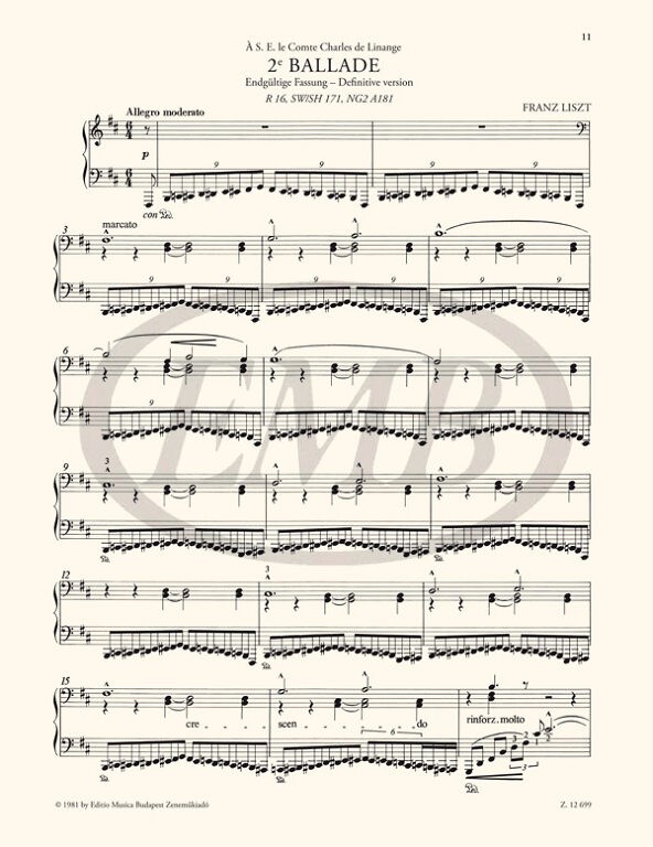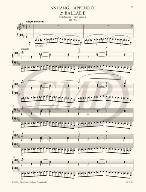 • Ennek az időszaknak a termése a 2. ballada is. A h-moll szonáta szomszédságában s azzal azonos hangnemben íródott darabon a figyelmes hallgató Schubert és Chopin hatását is észreveheti. Érdekes, hogy a mű mintha hasonló utat járt volna be, mint az őt komponáló mester: elsőre látványos, harsogó befejezést kapott, a végleges verzióban azonban szolid, lírai kicsengést nyert. E kettősség könnyedén tanulmányozható a kiadványban, mivel az mindkét verziót tartalmazza. A kottát új közreadói előszó, egy facsimile és kritikai jegyzetapparátus teszi értékes, tudományos igényű kiadássá.