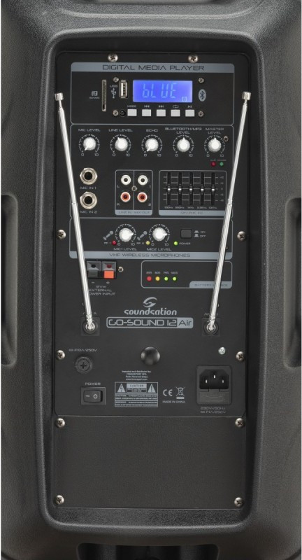 • A Soundsation GO-SOUND újabb lépést tesz előre és Go-Sound Air-ré válik. Megtartva a korábbi Go-Sound AMW sorozat összes funkcióját (akkumulátor vagy hálózati táp, kerekes mozgatás teleszkópos fogantyúval (csak a 10"-os modell), VHF vezetéknélküli mikrofon, USB/SD-kártya/BT lejátszó, mikrofon/vonal bemenet, 2-sávos grafikus EQ, stb.), lehetővé teszi a multimédia lejátszó és a sztereó vonalbemenet vezérlését az új "Go-Sound Air" alkalmazáson keresztül Android és iOS eszközökre egyaránt (töltse le a Google Play® vagy az AppStore® áruházból). Még soha nem volt ilyen egyszerű lejátszani és irányítani kedvenc lejátszási listáit mobiltelefonjáról: csak csatlakoztassa a hangszórót és az alkalmazást BT-n keresztül táblagépéhez vagy telefonjához és már kész is. Ahogy az előző AMW széria, akkumulátorról 2.5 órát (maximum hangerőn, teljes töltésnél) - 4 órát (normál hangerőn, teljes töltésnél) működik. Mind a 12" és 15" változat AB-osztályú erősítőt tartalmaz 800W csúcsteljesítménnyel (hálózatról használva). A polypropylene ház erős és könnyű, fém ráccsal, 36mm-es standard hangfalhüvellyel és akusztikai béléssel rendelkezik.