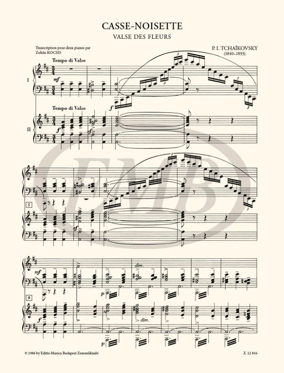 • Jelen kiadás Csajkovszkij híres Diótörőjének népszerű részletét, a Virágkeringőt tartalmazza Kocsis Zoltán (1952-2016) két zongorára készített átiratában.